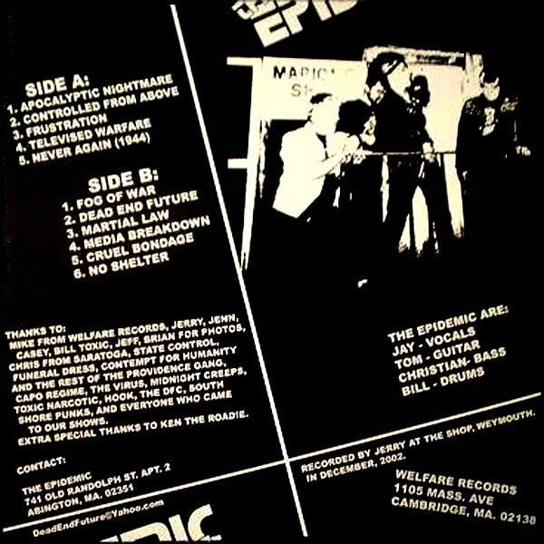 The Epidemic “s/t” LP (Welfare) – Where the fuck did these guys come from? They’re from Boston, but I’ve never heard of them… goes to show that I (if you can believe it) am NOT the end all be all of local punk music. This hit slab is 11 tracks of UK 82 style punk assault on society, the media, and all the other things that really pissed off punk bands sing about. There is nothing really groundbreaking here. It’s a typical punk rock record. Jay’s vocals remind me of Jorge, our favorite Casualty and the songs are fast and to the point. A solid release and a good punk record. (P)